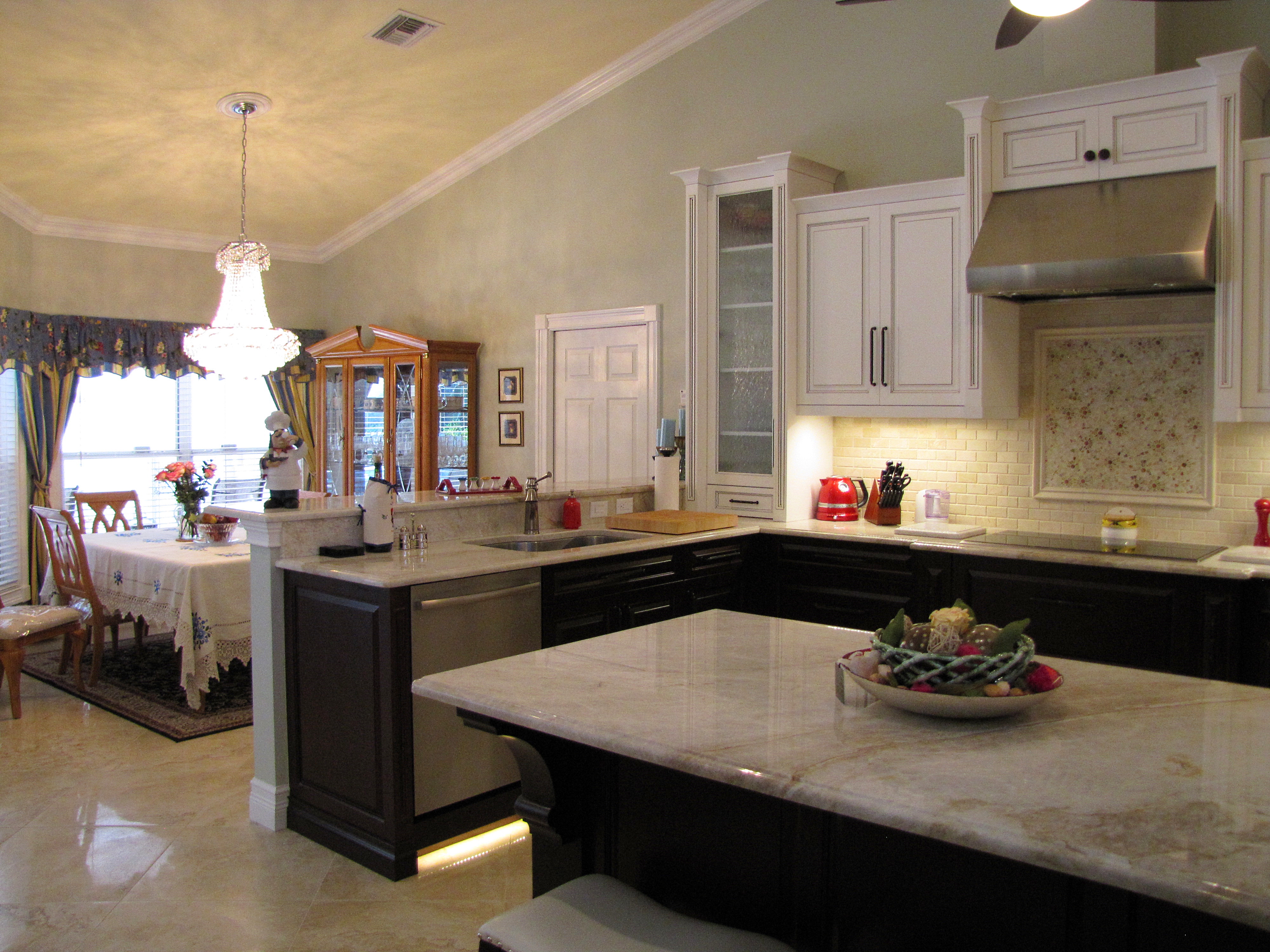 the dining area to where food can be conveniently passed via the breakfast bar. The counter tops are exotic