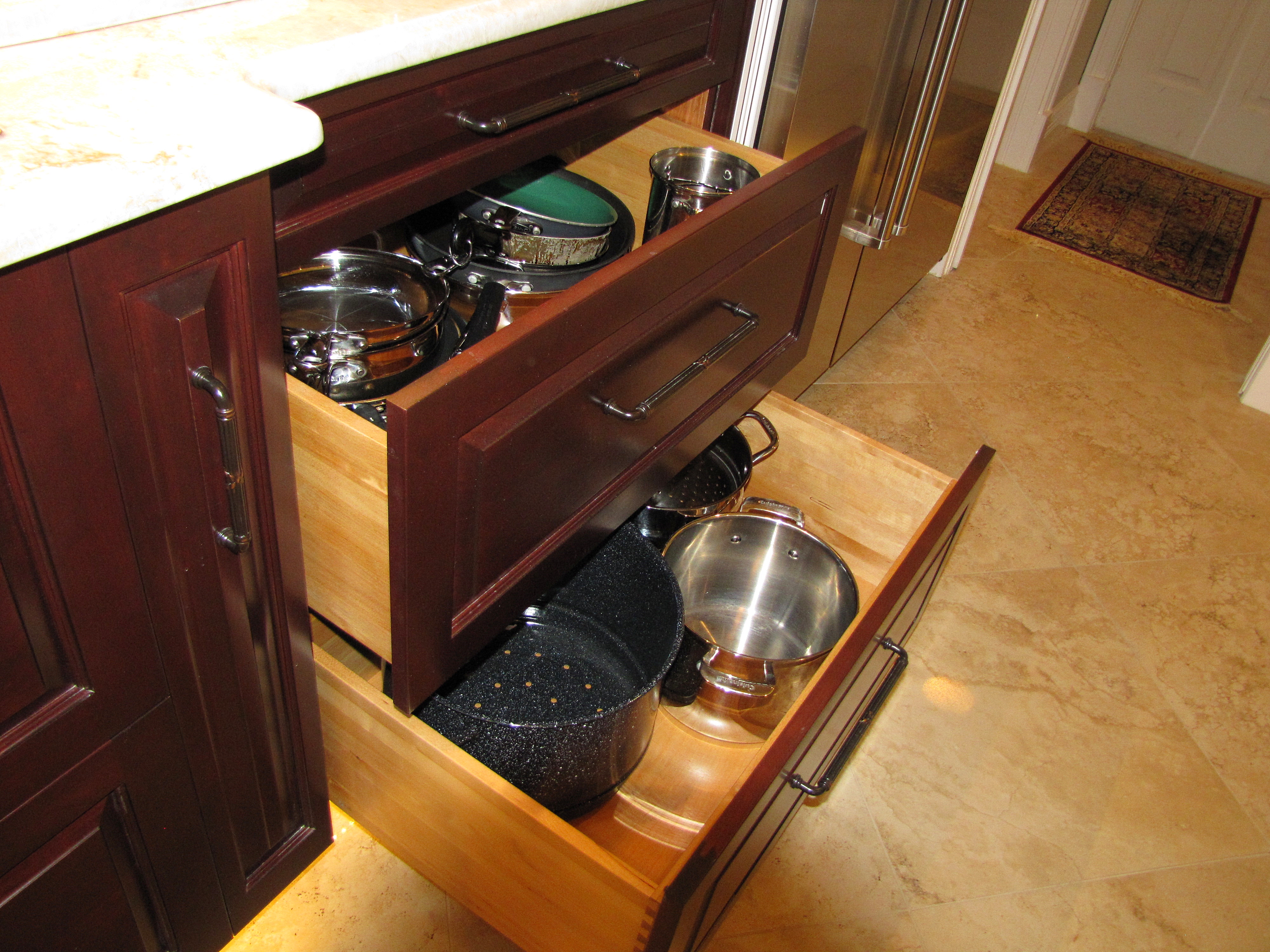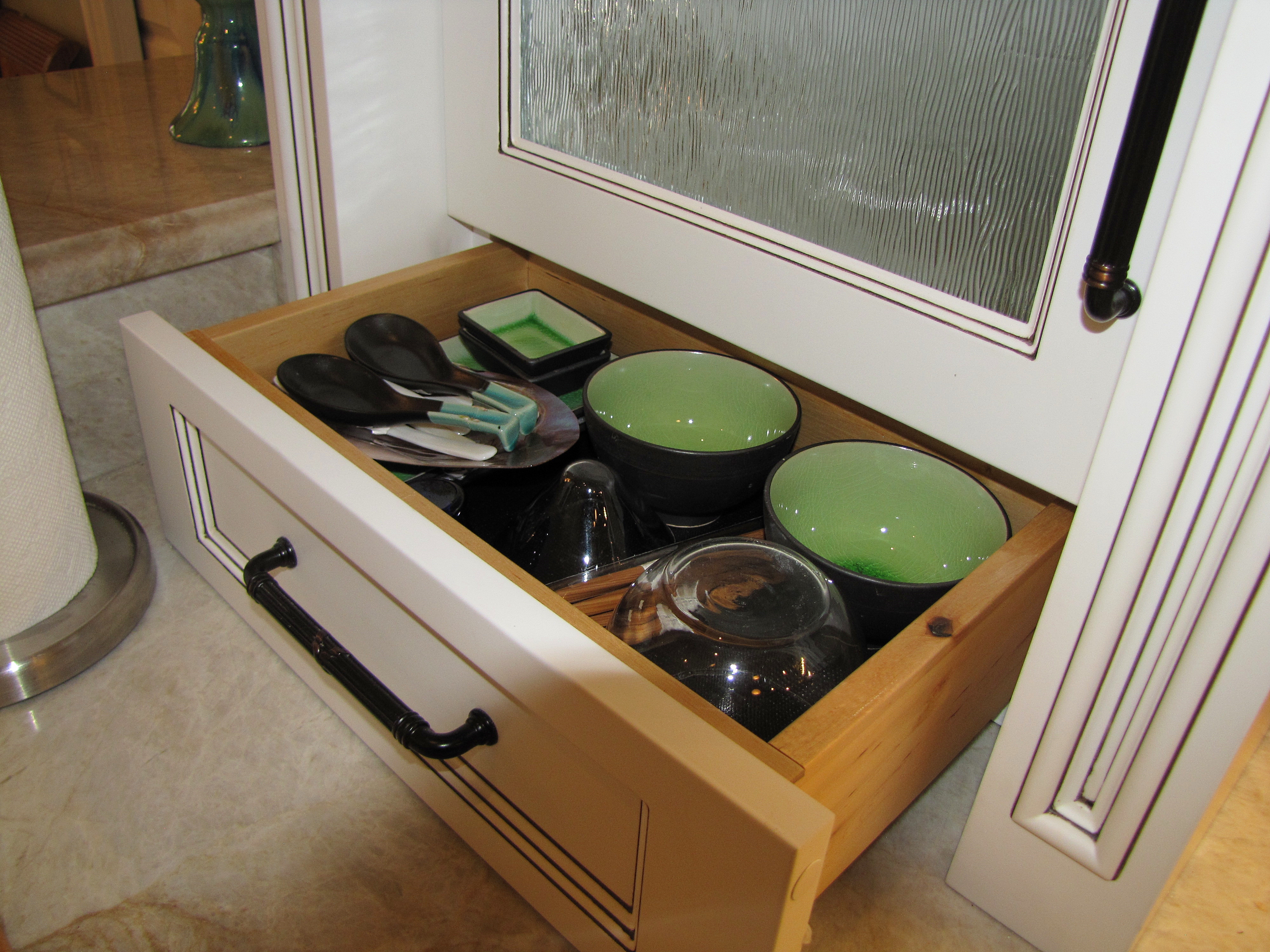 drawers so you don't have to kneel down to find things in the back, everything is self closing, the lighting is special, even the sink is custom and