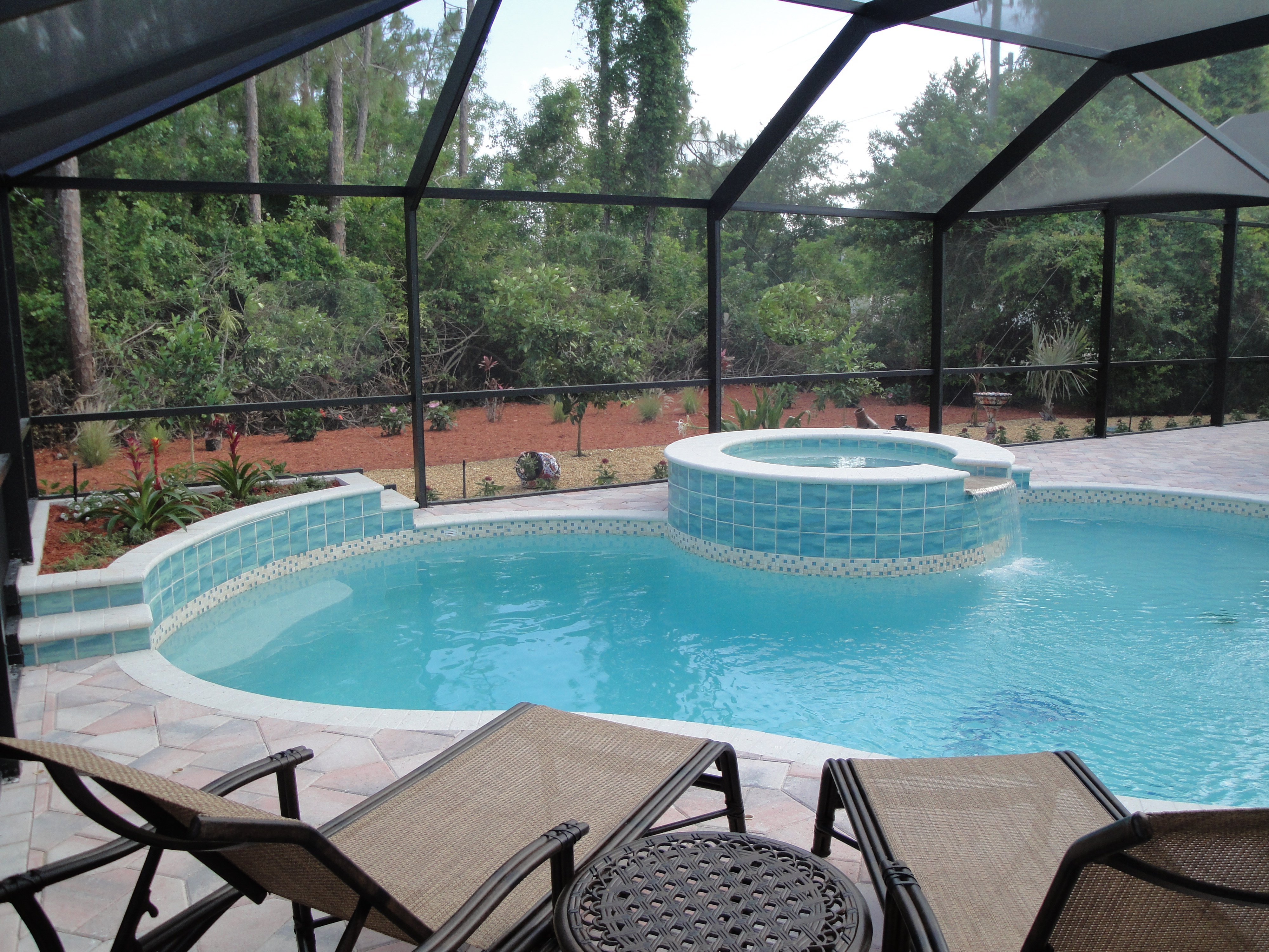 The wonderful pool is 25.5 feet long, 13 feet wide, 3 foot deep at the shallow end, and 6 foot deep at the deep end. It was custom built for us by the premier pool builder in Naples. It's maintained at a constant 88 degrees (or whatever you like) and the SPA is separately heated.