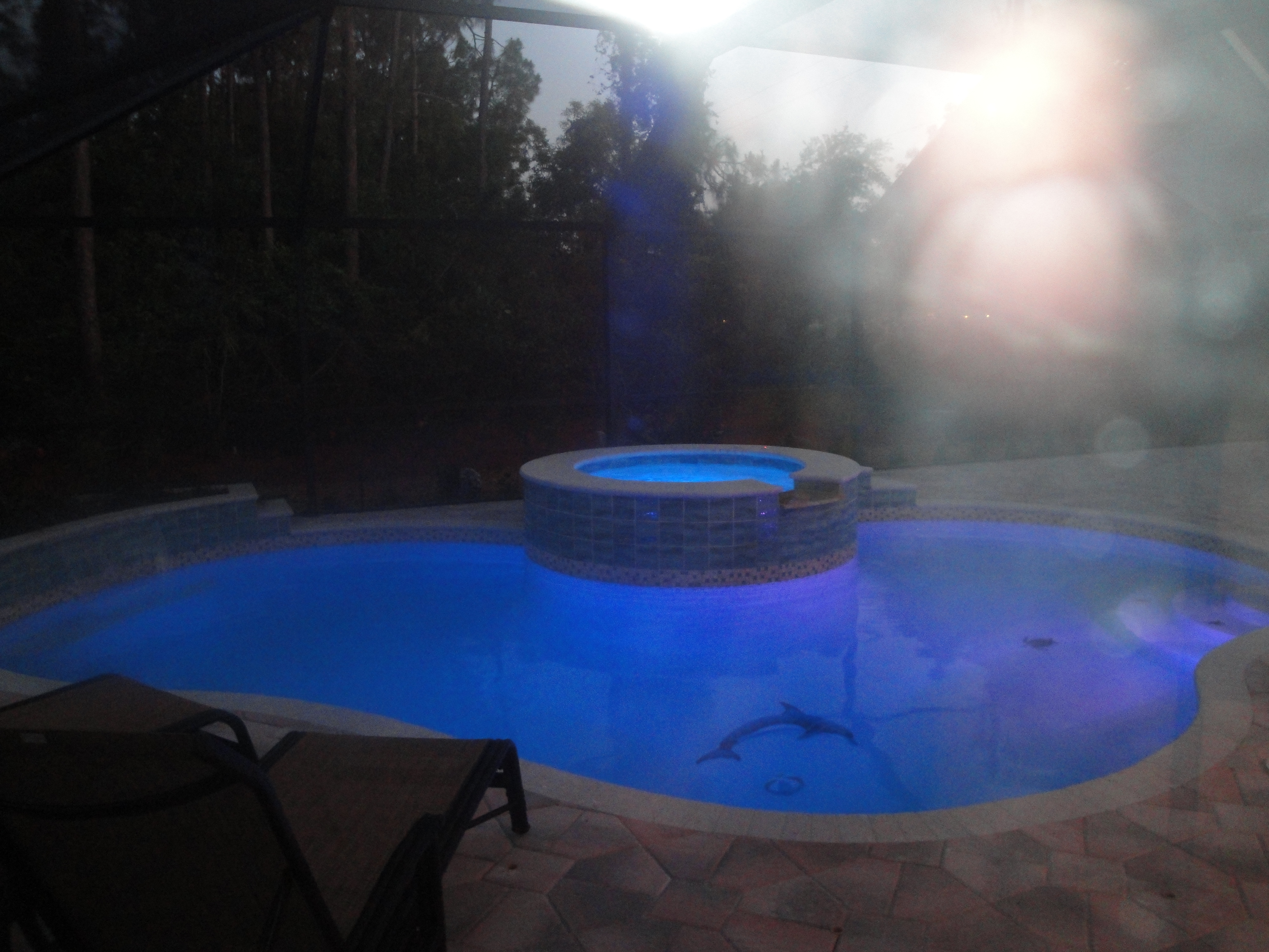 The swimming Pool & Spa are lighted by LED lights that change in color from time to time. The display is amazing. The picture on