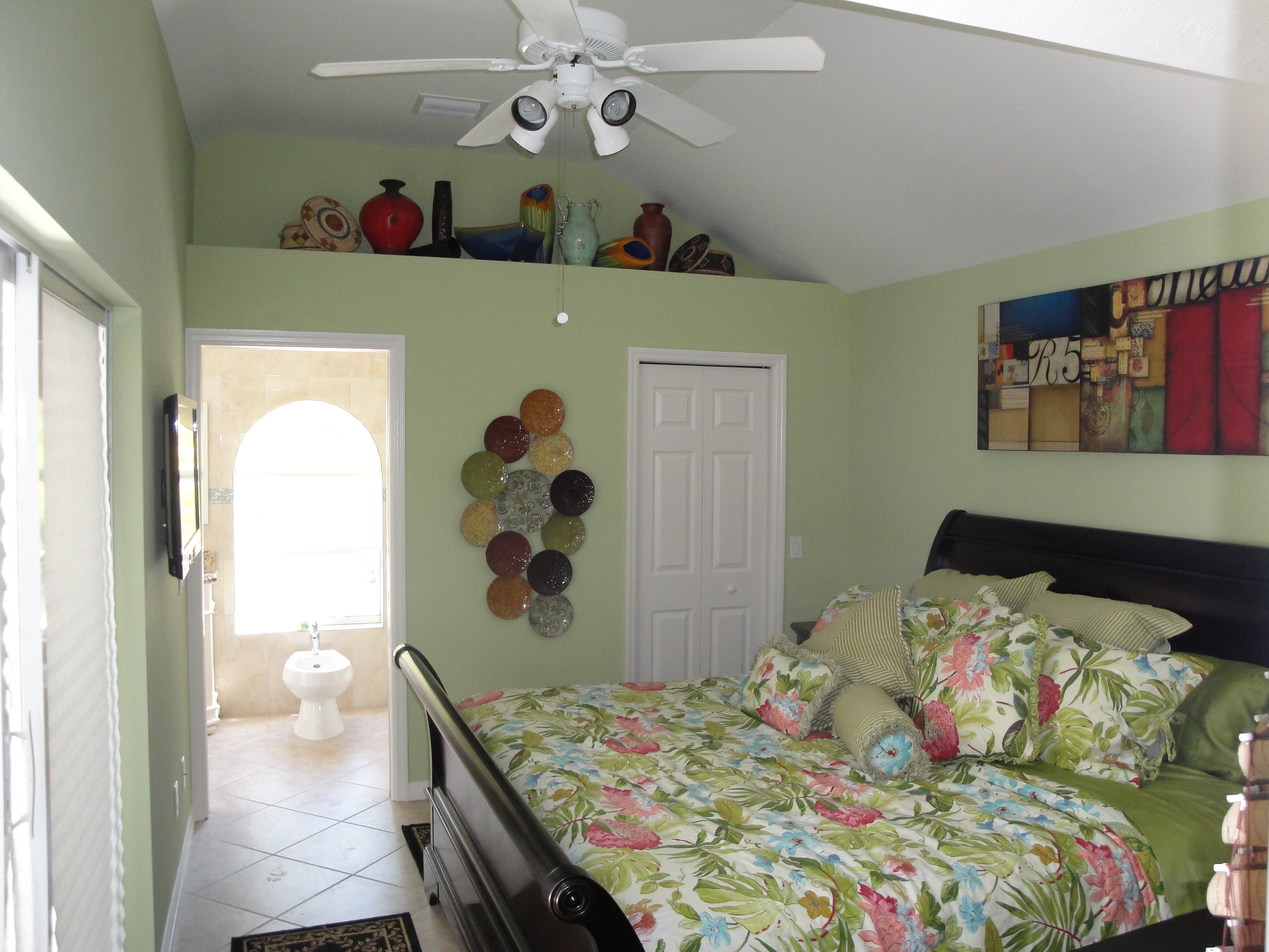 Also opening onto the lanai pool and spa area this ample suite boasts cathedral ceilings, a very quiet multi speed ceiling fan, nicely decorated plant shelves, a walk in closet and a bathroom (complete with bidet) that also opens to the pool and spa area also serving as a cabana. It has a wonderful king size sleigh bed featuring top of the line Egyptian cotton sheets.