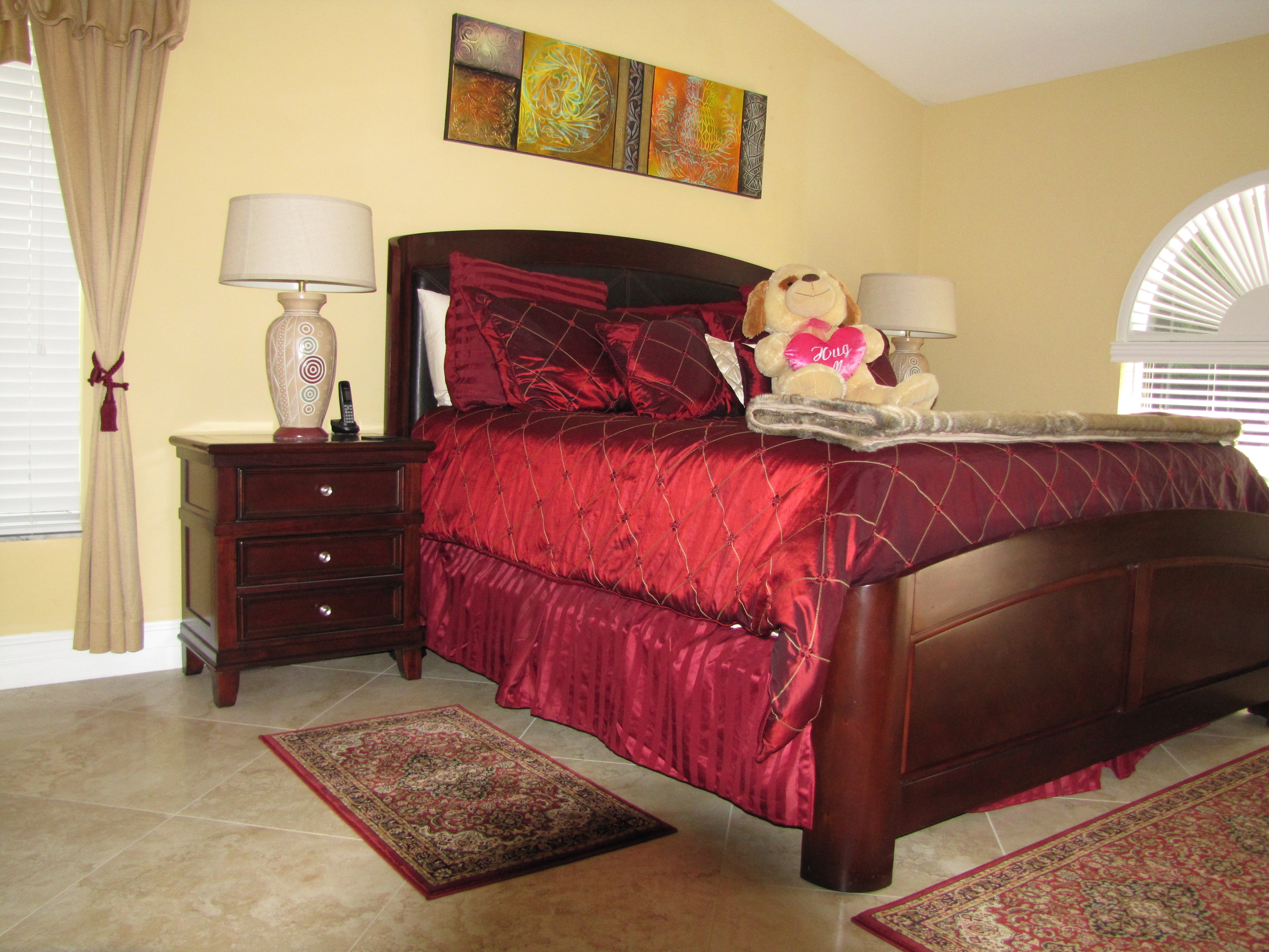 The very large King size bed features leather inlays as well as top of the line linens and comforters. All our sheets are the best quality very high thread count Egyptian cotton.