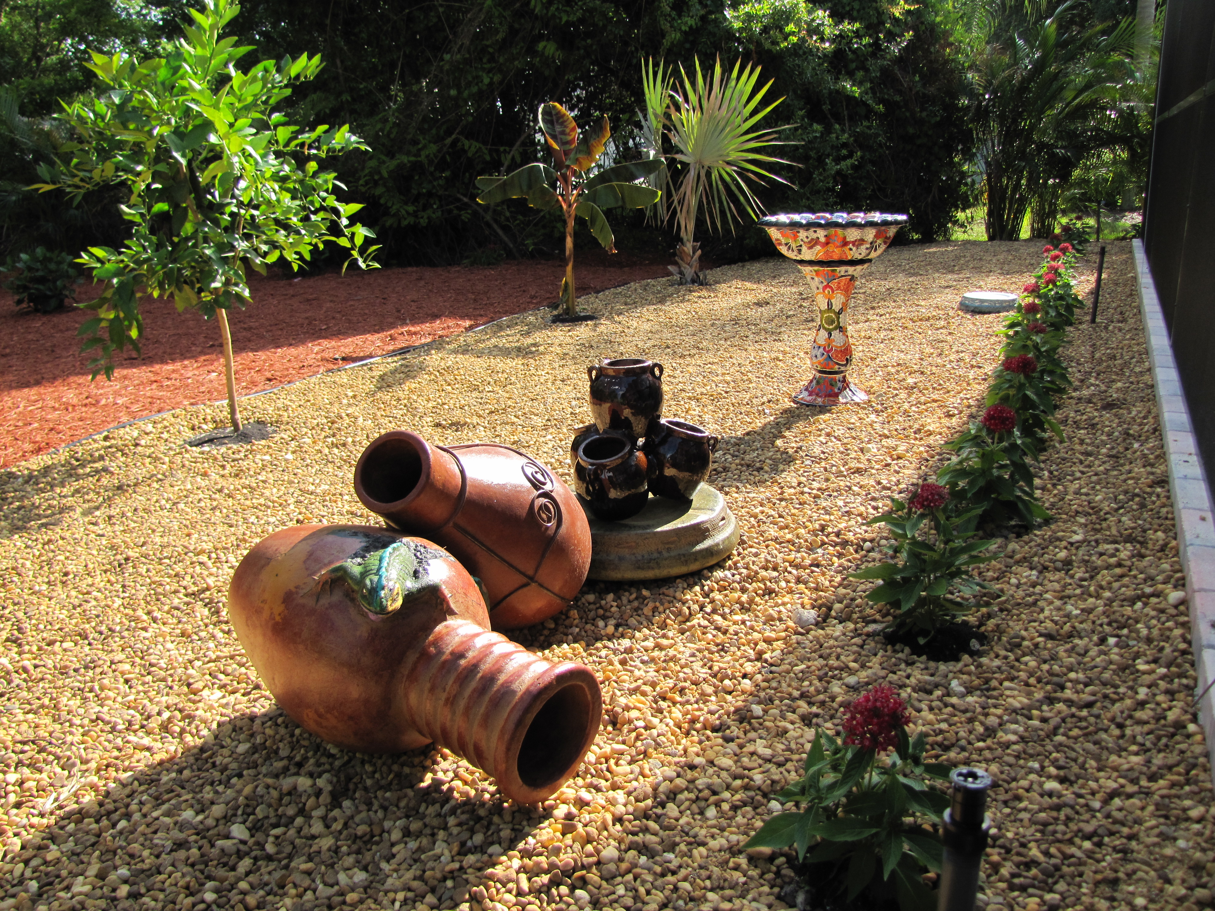 The partially covered Lanai is great for dinning or just sitting and watching the amazing birds that frolic in our amazing gardens just beyond the swimming pool. In the gardens you will find prolific fruit trees, many flowers, and interesting vases and of course the obligatory palm trees.