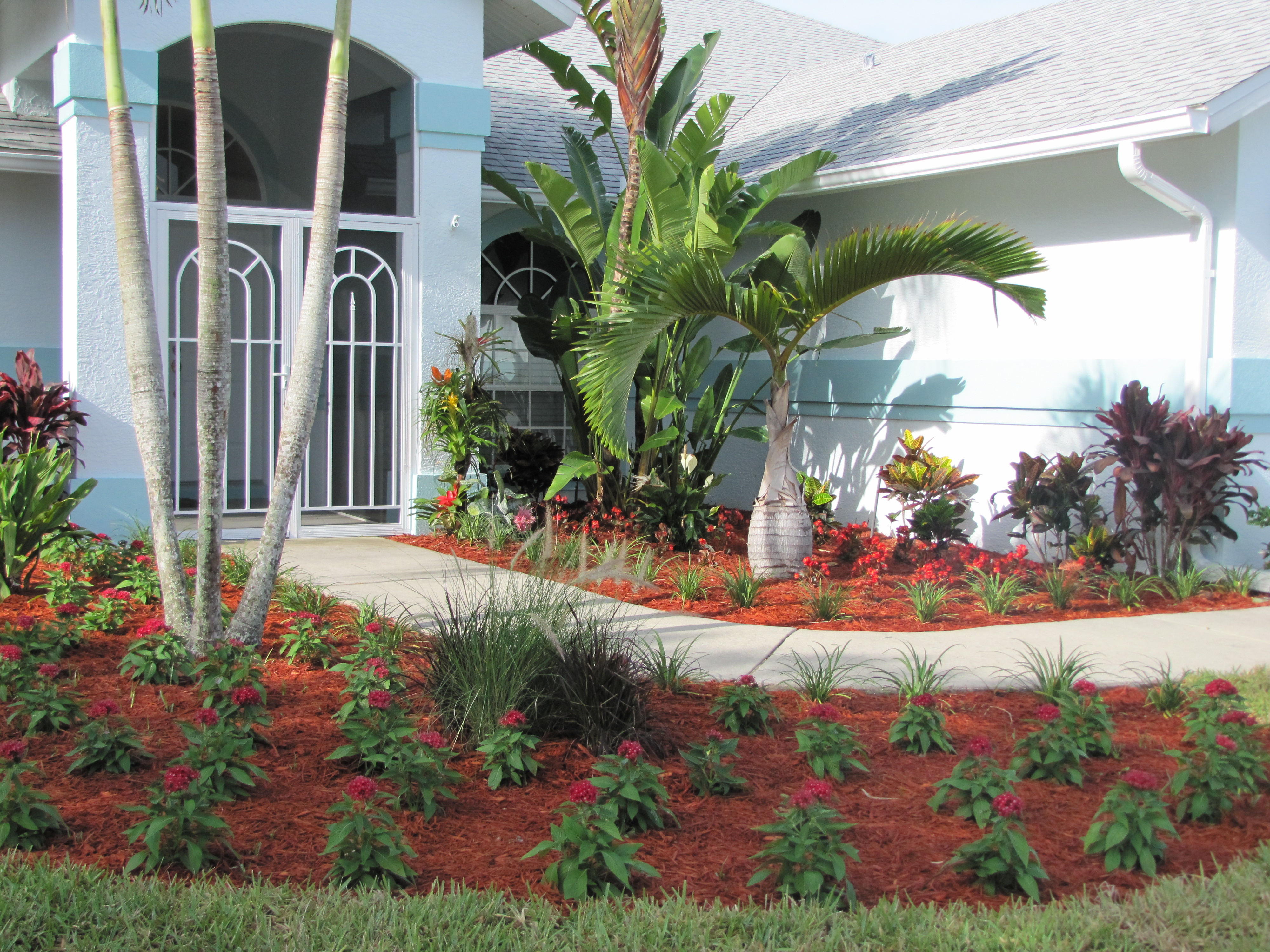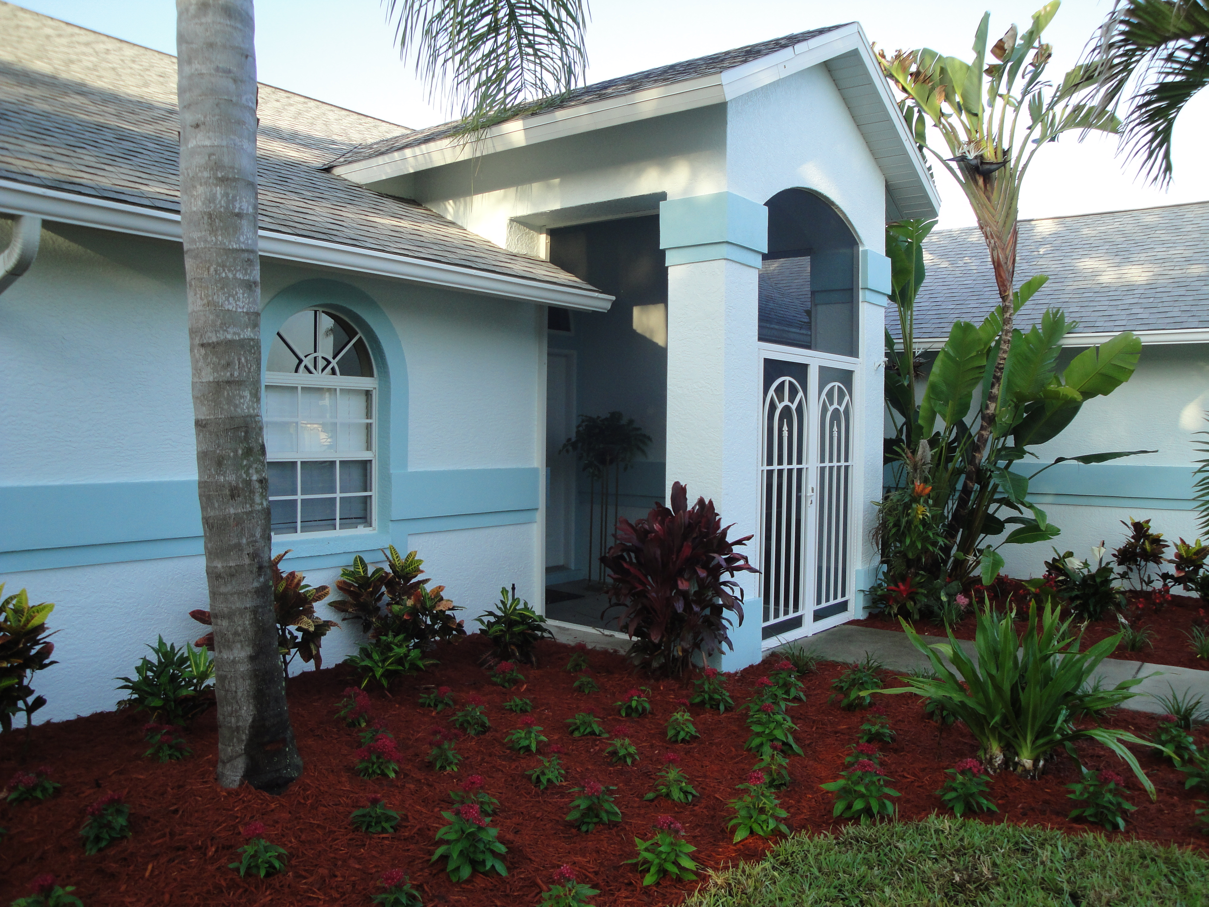 You enter our home through a small lovely courtyard surrounded by palm trees and tropical flowers.